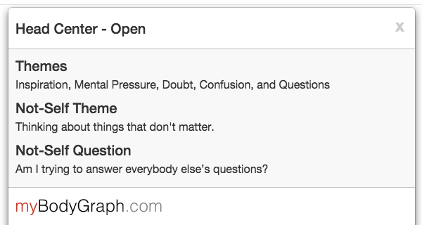 If the Center carries consistent definition in you, do you recognize this energy as a part of your true nature? As an example, if your Head Center (top of the BodyGraph) is colored in yellow, you are here to be mentally inspiring for other people.