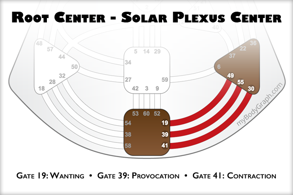 Pressuring the most important mutation in our history, your Root Center brings the energy that fuels emotional awareness and relational intelligence expressed in your Solar Plexus. With definition of these channels, you experience a fixed way of dealing with tribal relationships, individual emotional stress and collective desire to share new experiences.