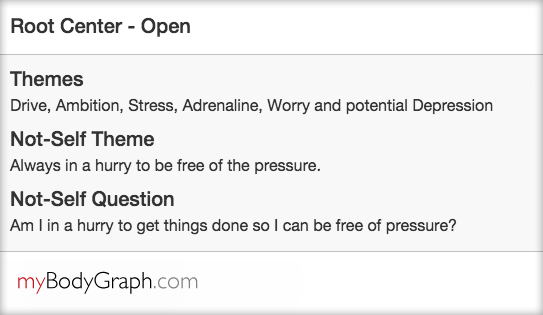 Your Root Center is both a pressure center and a motor - as opposed to the only other source of pressure, your Head Center. We humans live in a 'pressure sandwich', amplified if you have these centers undefined. Note that neither center has direct access to your Throat Center, and your Root is the only motor in your bodygraph without direct access to expression and manifestation.