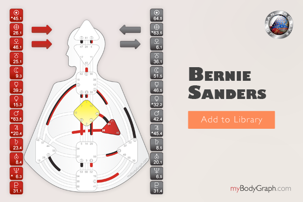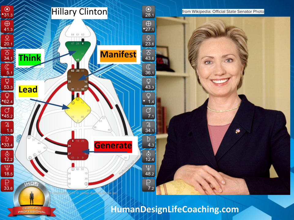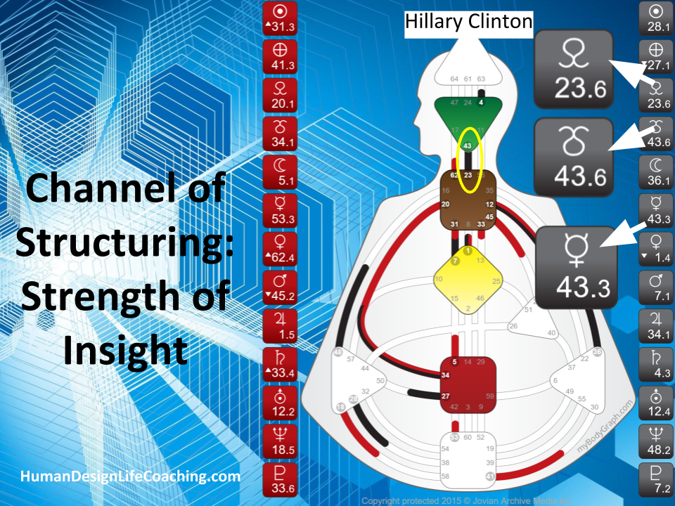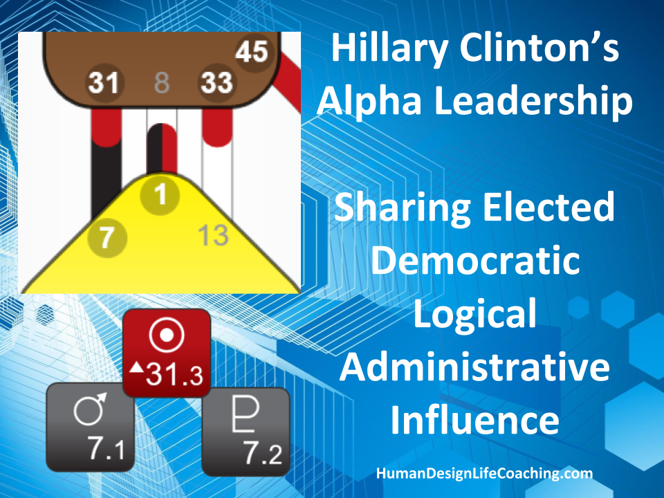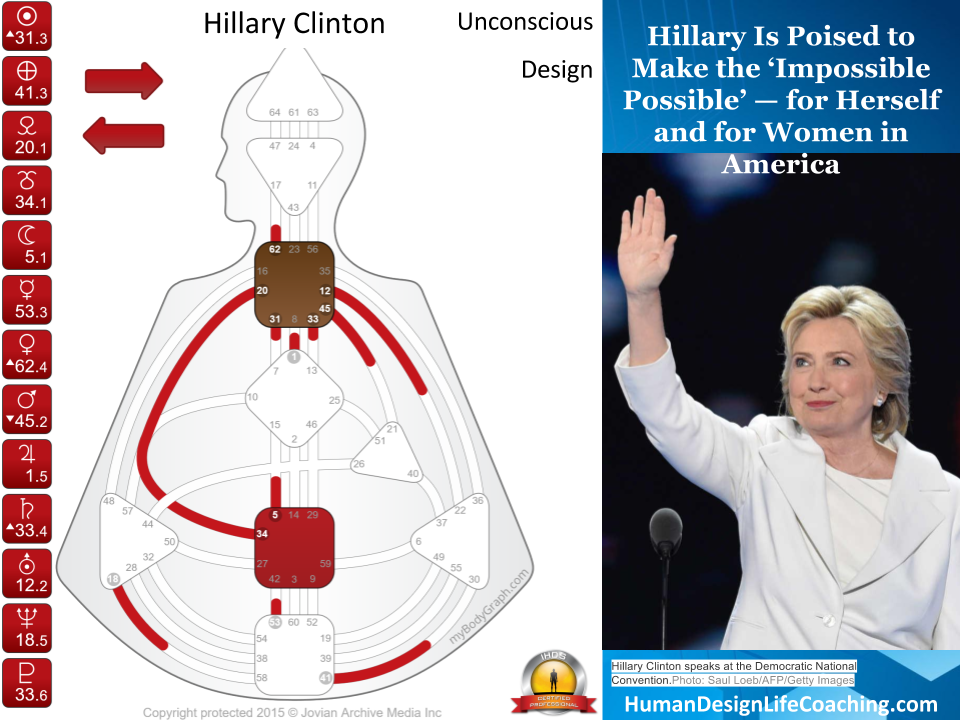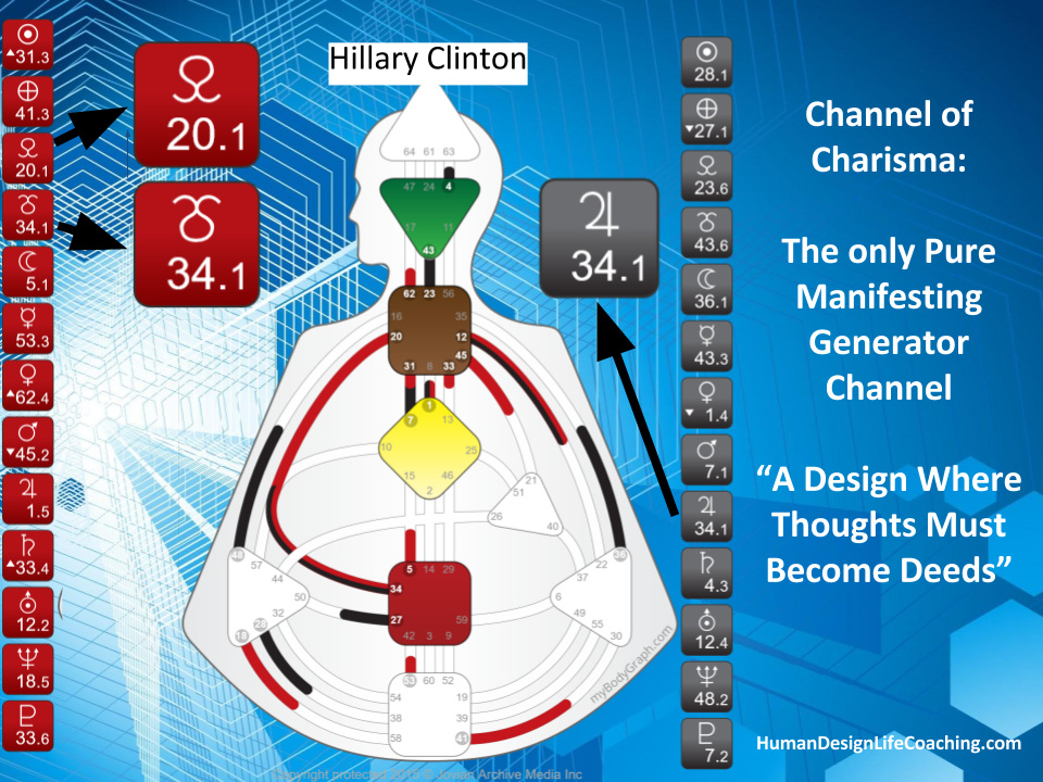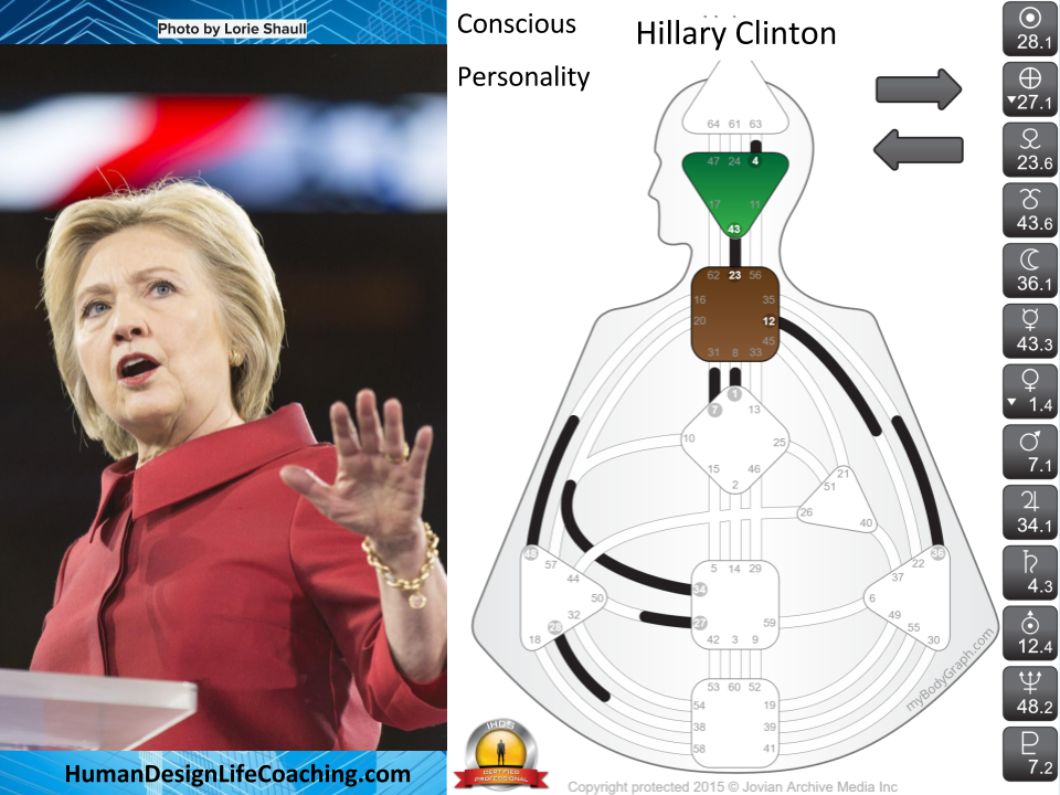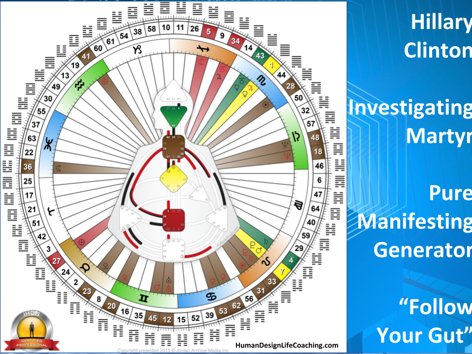 A primary theme in Trump’s life is to learn to navigate and master the material plane. Fueled by the 45/21 Channel of Money, a design of a Materialist, Trump has the willpower to make promises and lead large groups of people. This channel is the ruling expression of the tribe; politically the tribal Monarchy. This is a channel of dictatorship, the strength of someone who is designed to rule as a king would. In a large organization, the 45/21 (Education/Implementation) is management. This is not a design of leading the collective like the 13-33 channel of the Prodigal, the design of a Witness, or the 7-31 Channel of the Alpha, a Design of Leadership (for good or bad) which is a democratic strength Hillary Clinton has.