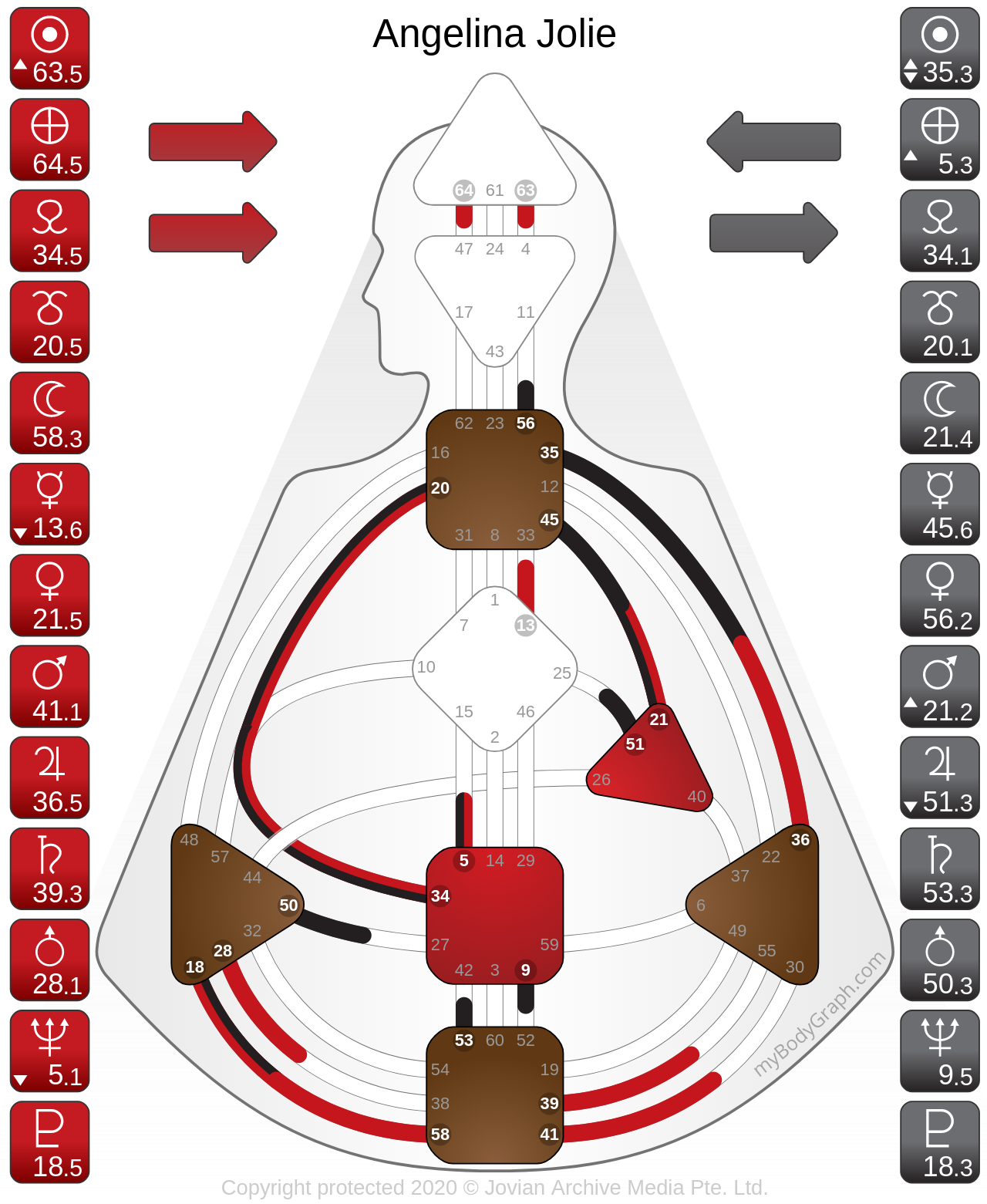 However, take a typical example of a Manifesting Generator since there are many on our planet. In the not-self dysfunctional state (initiating rather than waiting for a response), an overactive MG can tend to have hyperthyroidism issues. See Angelina Jolie’s chart for example of a strongly defined throat. Angelina has an ego and emotional Manifesting Generator design with an Adrenalized Splenic Center Split.
