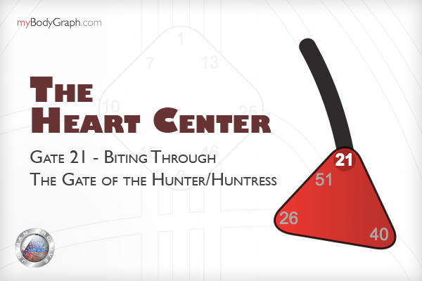 Associated with your Heart muscle itself, Gate 21, “Biting Through” is the only gate in the bodygraph that is designed to be in control of circumstances to serve and protect the Tribe. This gate has the most powerful ego and provides the willpower to make sure that the community has what it needs. Everyone who has the 21 defined must be allowed to exercise their power to be in control when it is correct for them. No other gate has more potential to control than this one does.